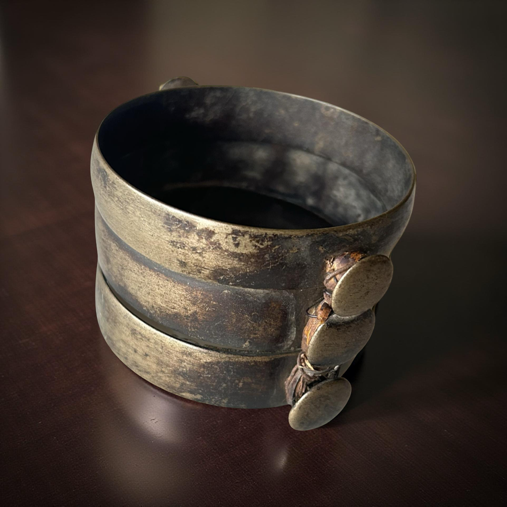 A weathered oxidized surface and the design with multiple bands and decorative studs is a piece of traditional jewelry crafted from brass by artisans of the Naga tribes in Nagaland, Northeast India.The Naga people, an average indigenous group with over15 ethnic subgroups [such as the Konyak, Angami, and AO] have a rich history of metal working, particularly in brass, which was traded from the plains and cast into prestige items.These armlets were typically worn by men above the elbow during ceremonies, festivals, or as symbols of status, bravery, wealth-often earned through feats like successful headhunting raids [a practice banned in the mid-19th century but commemorated in adornments.