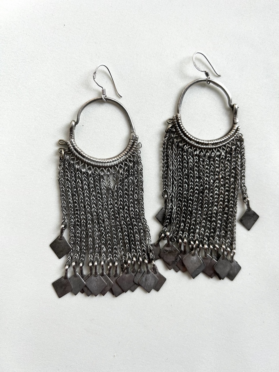A pair of hoop silver earrings with 16 tassels of silver chains on each side.