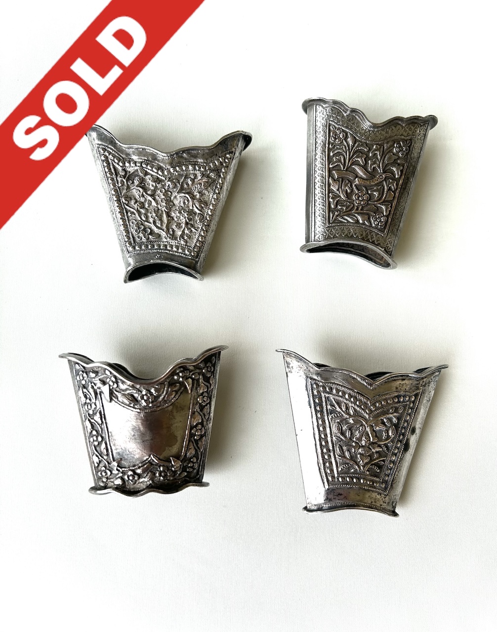 The betel leaves are inserted through the openings of these holders for straining excess water from washing. Though no longer existing today these are made by local smith in Indonesia. Floral scroll and birds are depicted on two of the four pieces. The sightly copper hue is due to its silver content of around 60 percent.