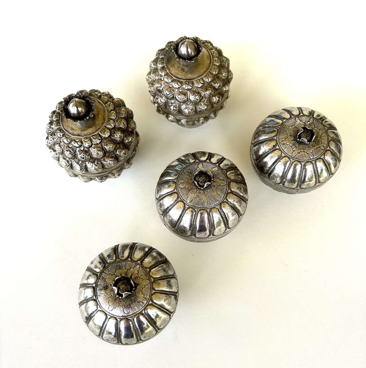Five silver stemmed round shape boxes Makassar 1930's-1950's
