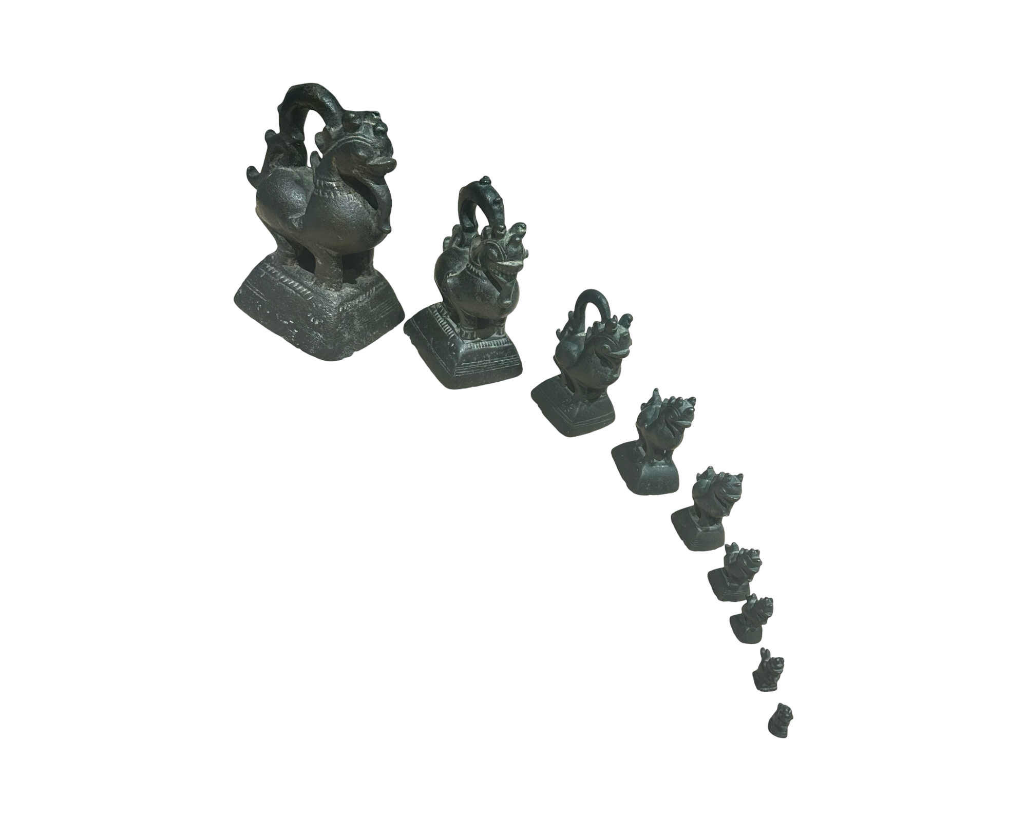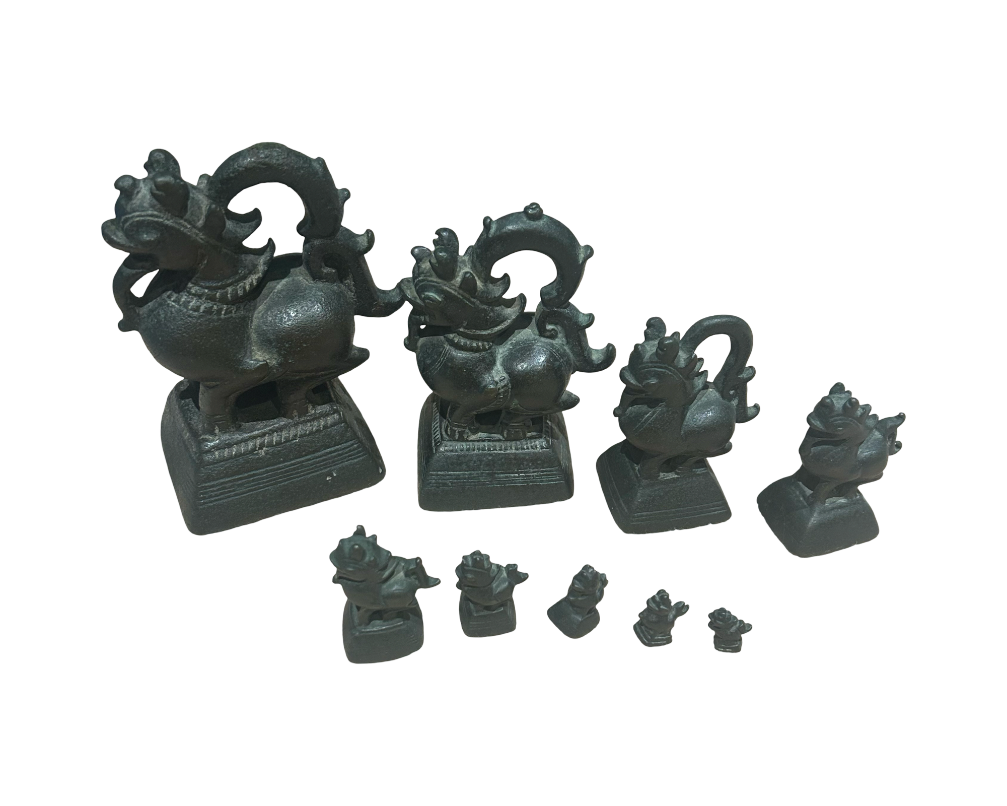 Antique Burmese hintha bird opium weights, nineteen century, crafted from bronze. These culturally significant artifacts depicts the mythical hintha bird, a national symbol tied to Burmese folklore and the founding legend of the Bagan Kingdom. Originally used in traditional trade for measuring opium or other goods on balance scales, these weights hold deep historical value, reflecting Myanmar's rich heritage and artistic traditions of the era. A cherished collectible, valued for its craftsmanship and connection to the nineteenth century Burmese history.