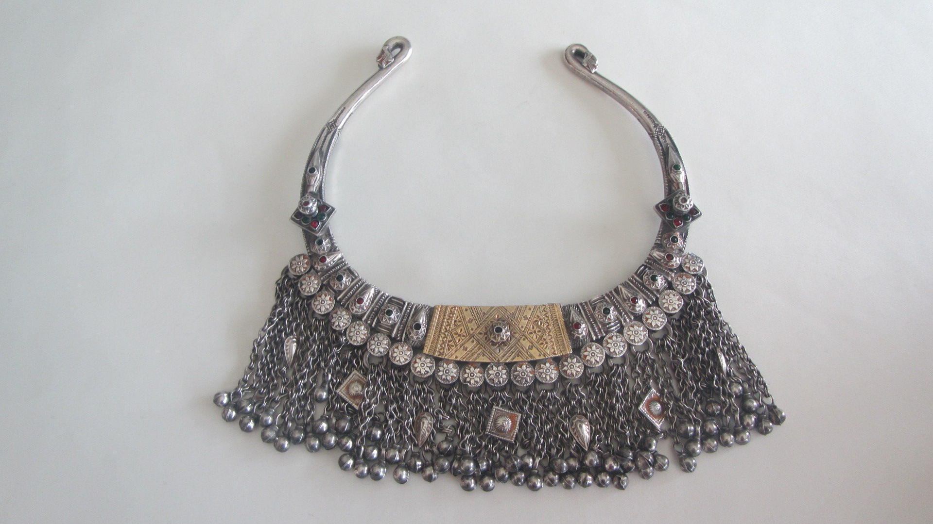 A superbe and elaborate silver neck ring covered with stamped-die silver pieces resembling flower buds and petals set in green and red glass stones. The centre square section is highlighted with a gold plated chiselled silver piece with a flower on it. Right below it are bells and chains supended from a row of twenty one flower discs. It tapers to a bird at the terminals.