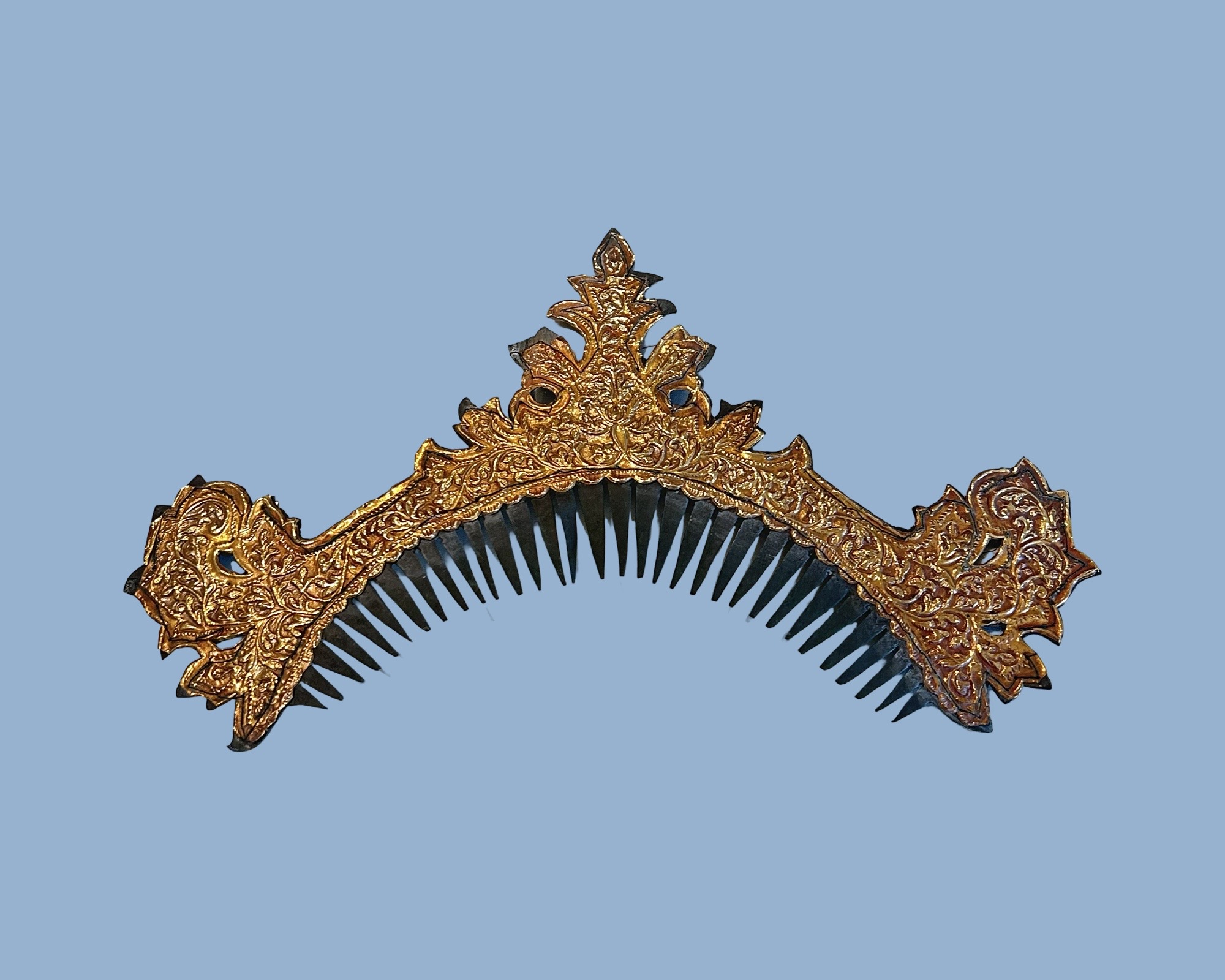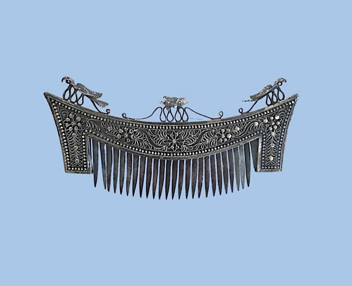 A traditional ceremonial hair comb from Lampung, crafted by neighboring Minangkabau communities known for their metal works. Such combs are often incorporated into elaborate hairstyles as part of bridal or festive attire, complementing the more prominent siger crown worn by Lampung women during weddings and cultural events.The siger itself is a multi-pointed golden hairpiece symbolizing nobility and heritage, but this comb serves as an accessory to secure and adorn the hair. The filigree designs include floral motifs and scrolling vines. The three birds on top of the comb could be swallows or phoenixes, adding to its ornate appearance. The arched-shaped evokes a boat or ship of the soul or ancestral voyages, a recurring symbol in the Sumatran textiles and ornaments, linking the living to their forebears and afterlife.