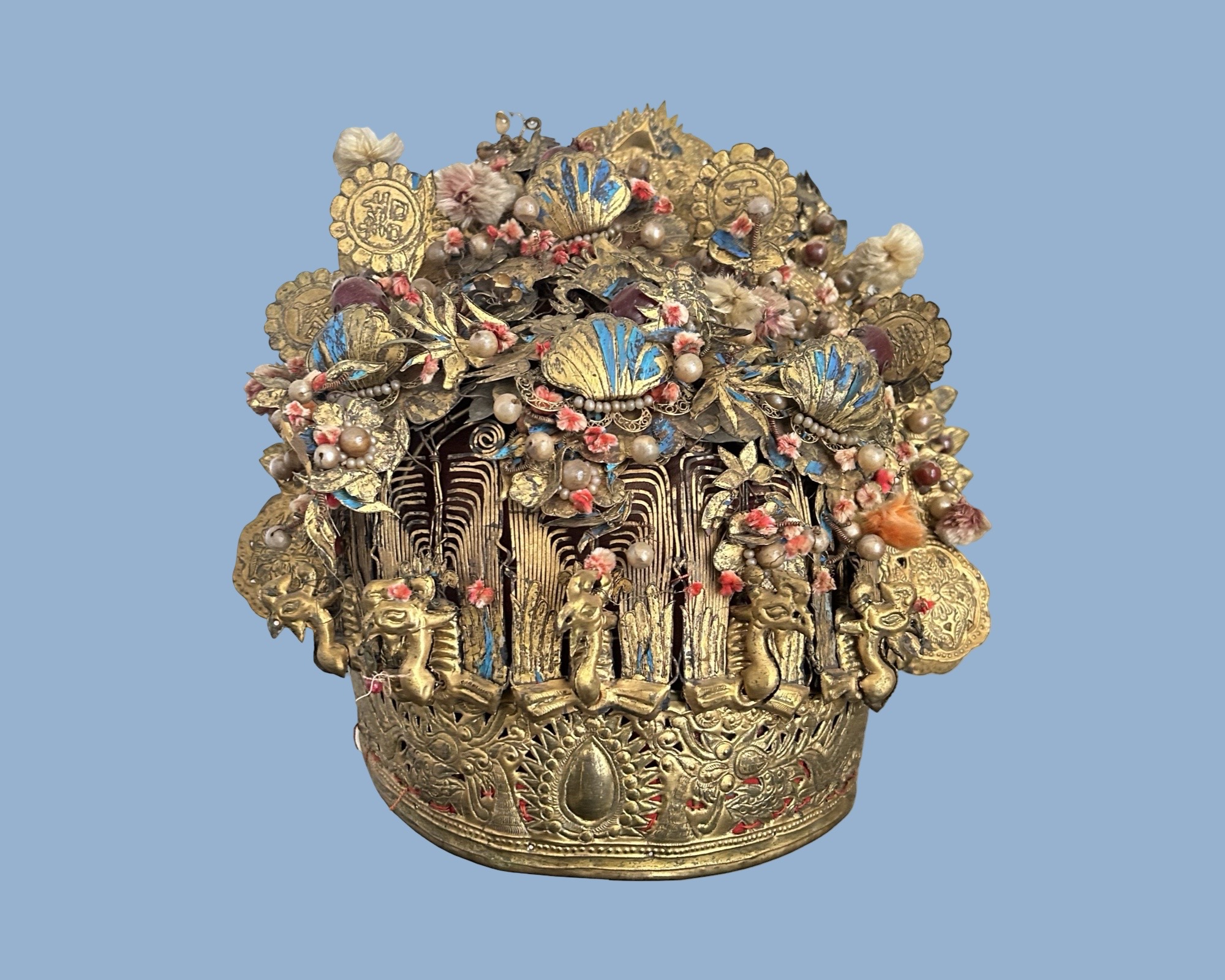 The fengguan, or phoenix crown, was a traditional Chinese headdress worn by noblewomen, empresses, and brides during the Ming and Qing dynasties. Forged from a gold-plated base with delicate filigree and carvings, it’s crowned by golden phoenixes-symbols of prosperity and fertility. Rare blue inlays come from kingfisher feathers, a luxurious import that shimmers vividly. Pink and red flowers, crafted from enamel and silk, mingle with pearls, beads, and gemstones like rubies or corals in motifs of blooms, clouds, and leaves. Social rank shines through the design: an empress’s might boast twelve dragons and phoenixes, embedded with thousands of pearls and over hundred gems.