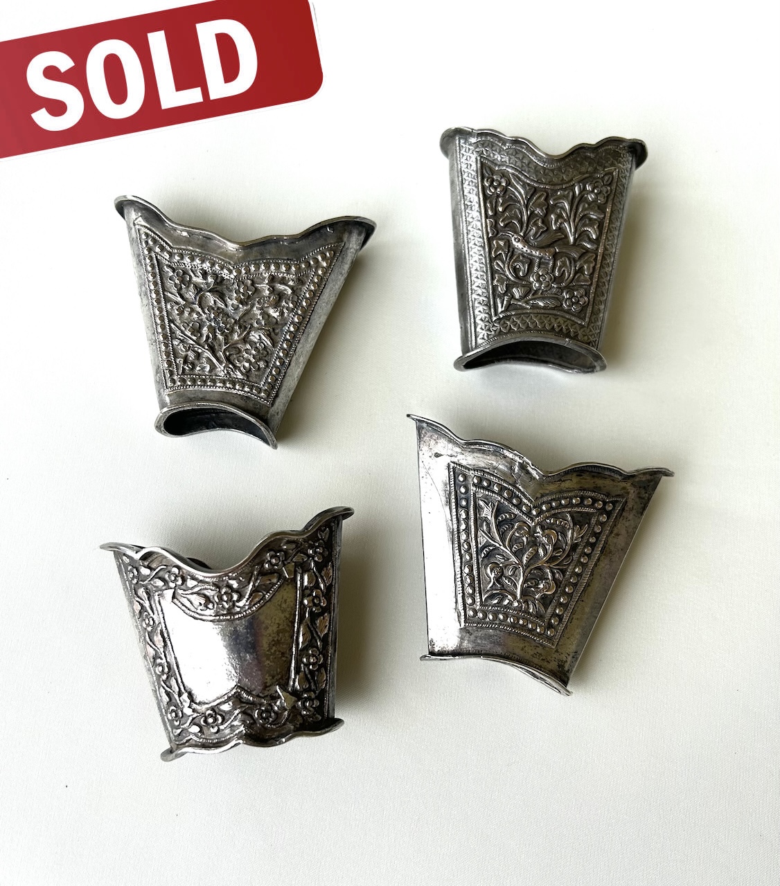 The betel leaves are inserted through the openings of these holders for straining excess water from washing. Though no longer existing today these are made by local smith in Indonesia. Floral scroll and birds are depicted on two of the four pieces. The sightly copper hue is due to its silver content of around 60 percent.