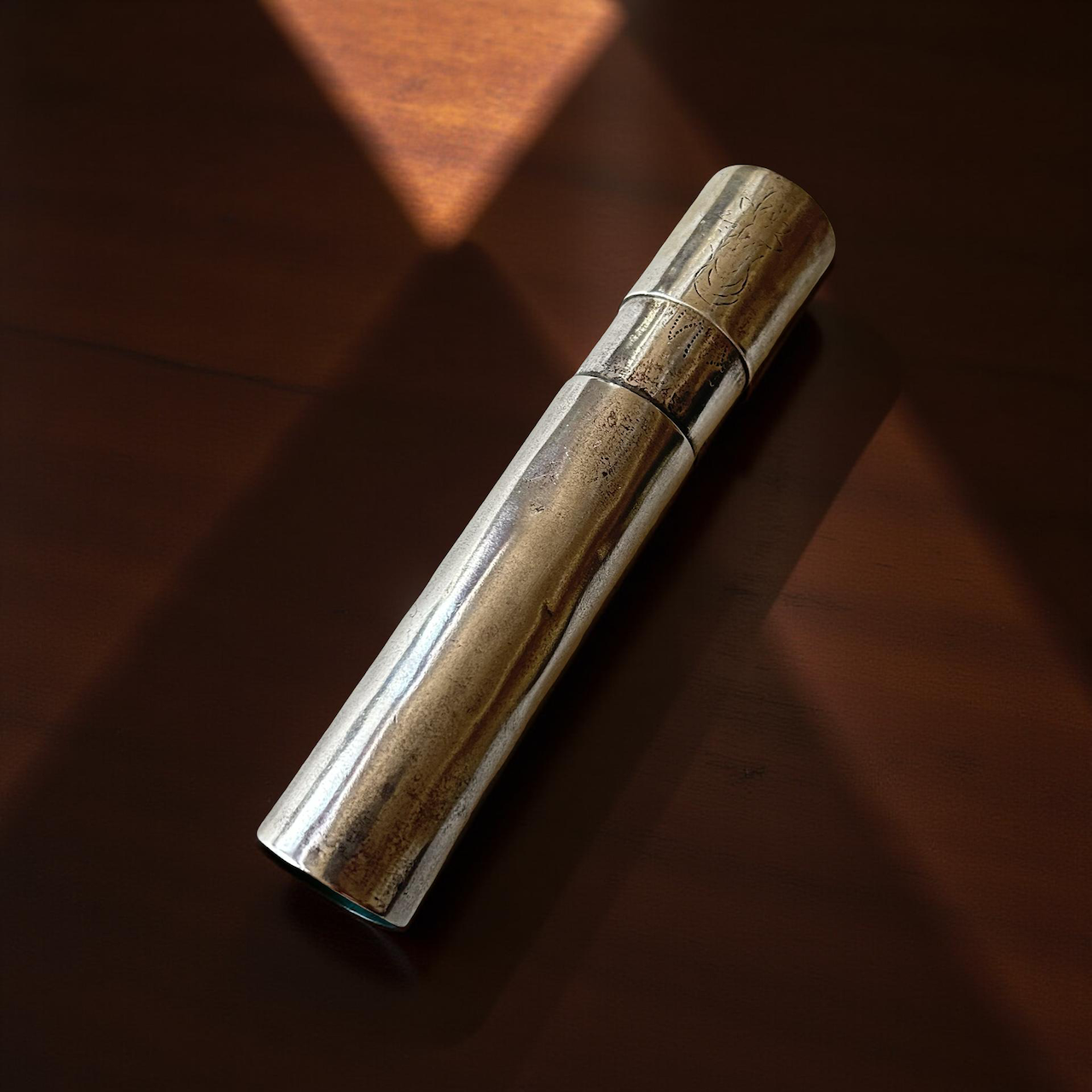 A Timorese lime container, etched with a flower on the lid. Each end is capped with vintage Dutch silver coins.