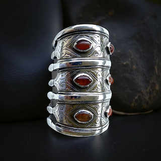 The Turkomans were nomadic farmers and herders that lived around the Karakum desert in Central Asia. Every Turkoman woman had a large amount of silver jewellery acquired through marriage. A bride from a wealthy family was usually covered with jewellery from head to toe. This was part of the dowry besides carpets and textiles on her wedding. The large amount of silver created for the Turkomans were bought with the carpets knotted by females. They were made of the purest silver by craftmen moving from nomad camps to nomad camps. Silver jewellery was the best form of security to be carted on their bodies in this hostile area of sandy plains as they can be simply exchanged for money and goods. On top of that they also functioned as protective amulets. Blue colour were supposed to deflect the evil eye and the orange carnelian stones embedded in these bracelets were symbolic of fertility, blood and life.