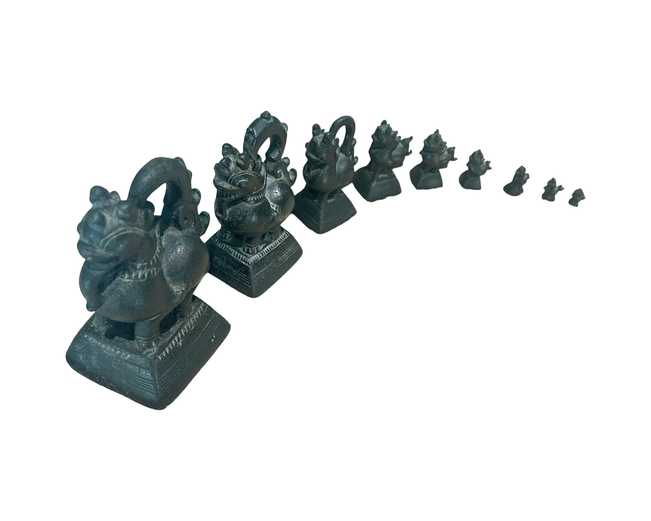 Antique Burmese hintha bird opium weights, nineteen century, crafted from bronze. These culturally significant artifacts depicts the mythical hintha bird, a national symbol tied to Burmese folklore and the founding legend of the Bagan Kingdom. Originally used in traditional trade for measuring opium or other goods on balance scales, these weights hold deep historical value, reflecting Myanmar's rich heritage and artistic traditions of the era. A cherished collectible, valued for its craftsmanship and connection to the nineteenth century Burmese history.