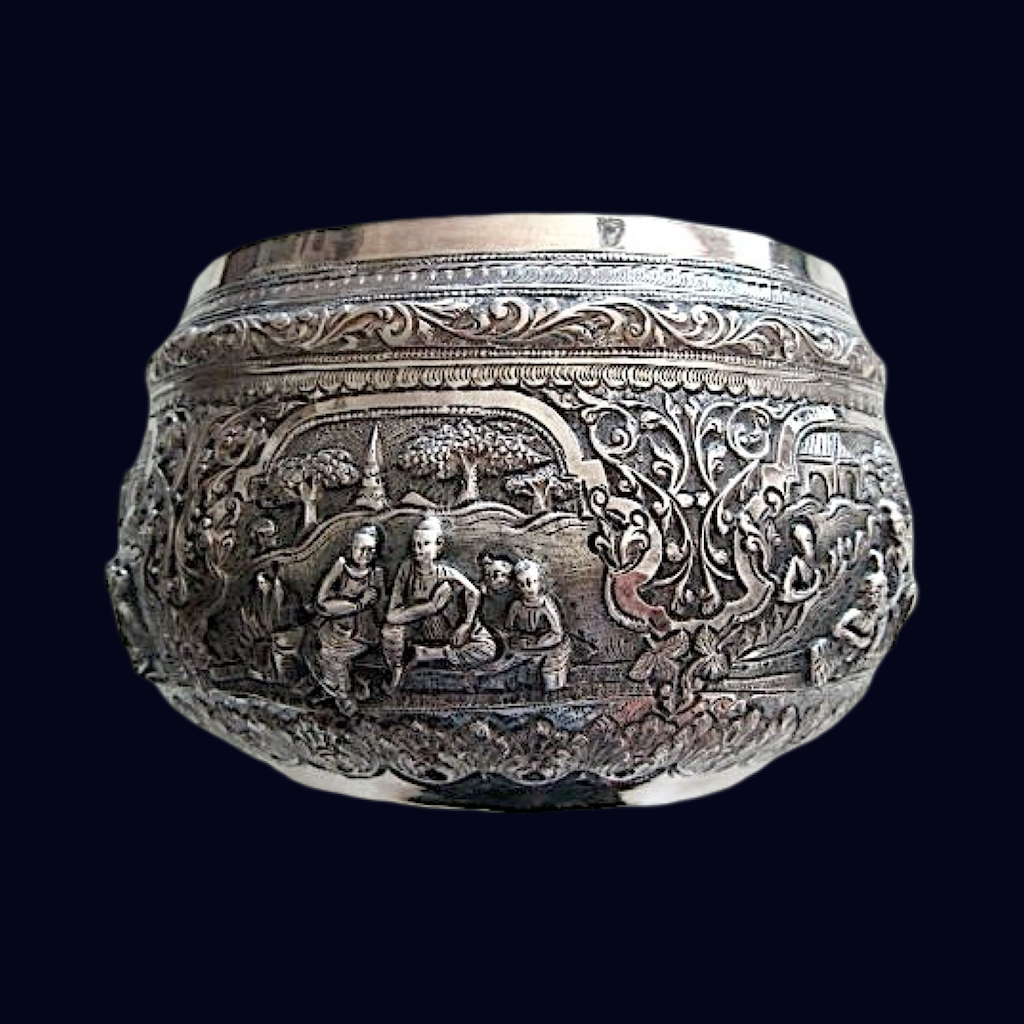 A finely decorated monk's bowl showcasing a pictorial scene framed by arches of plain polished silver, each arch is adorned with unique images of people performing daily chores. A rim of lotus petals encircles the bowl's base, symbolizing purity and enlightenment.These bowls also hold holy water for blessing Buddha statues outside temples.