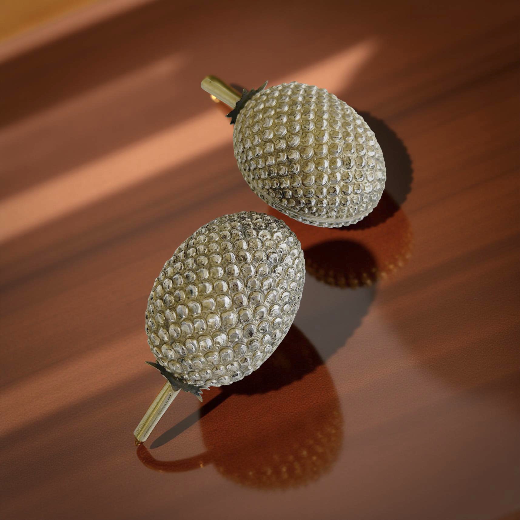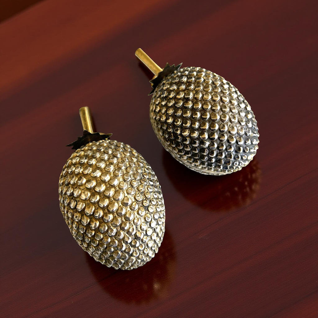 Two durian [pungent spiky fruit] shaped decorative ornaments. Durian has a reputation for bad smelling but tasting like heaven.