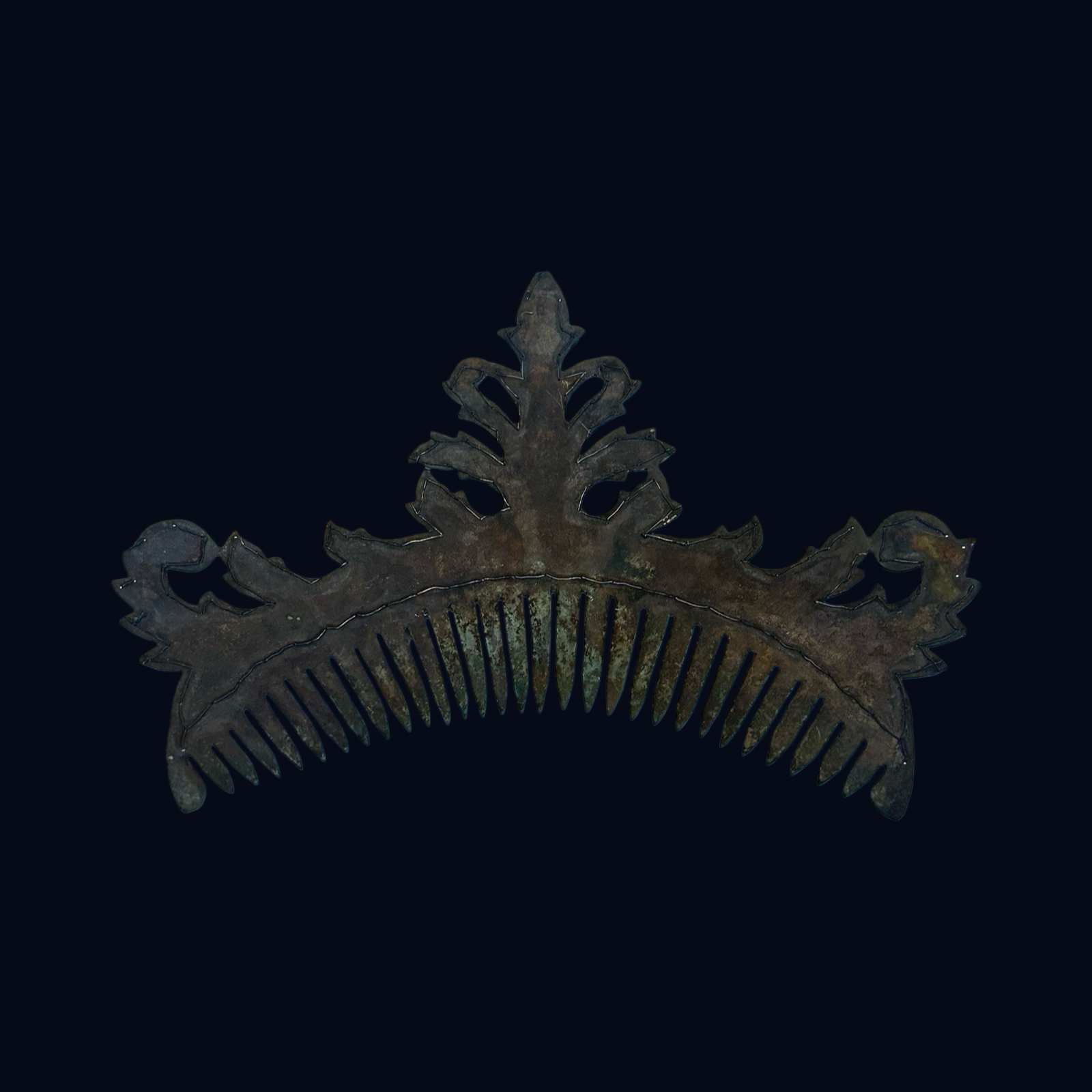 A traditional headdress known as siger Lampung. This ornate piece, often crafted from gold foil on metal, decorated with intricate floral and geometric engravings, is typically worn by women as part of bridal attire or during ceremonial dances and cultural events.The comb-like teeth at the base allow it to be secured into the hair, forming a crown shape that symbolizes nobility, beauty and dignity in Lampung culture. Historically, Siger designs date back to the 19th century or earlier, and they often feature motifs inspired by nature, ships or ancestral symbols.