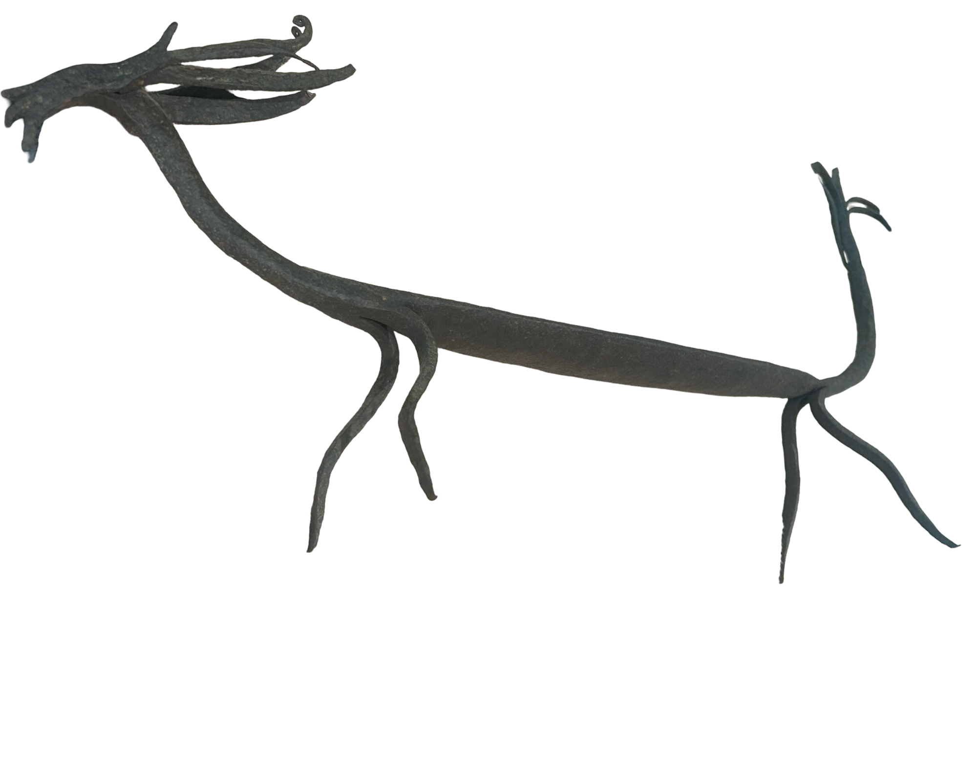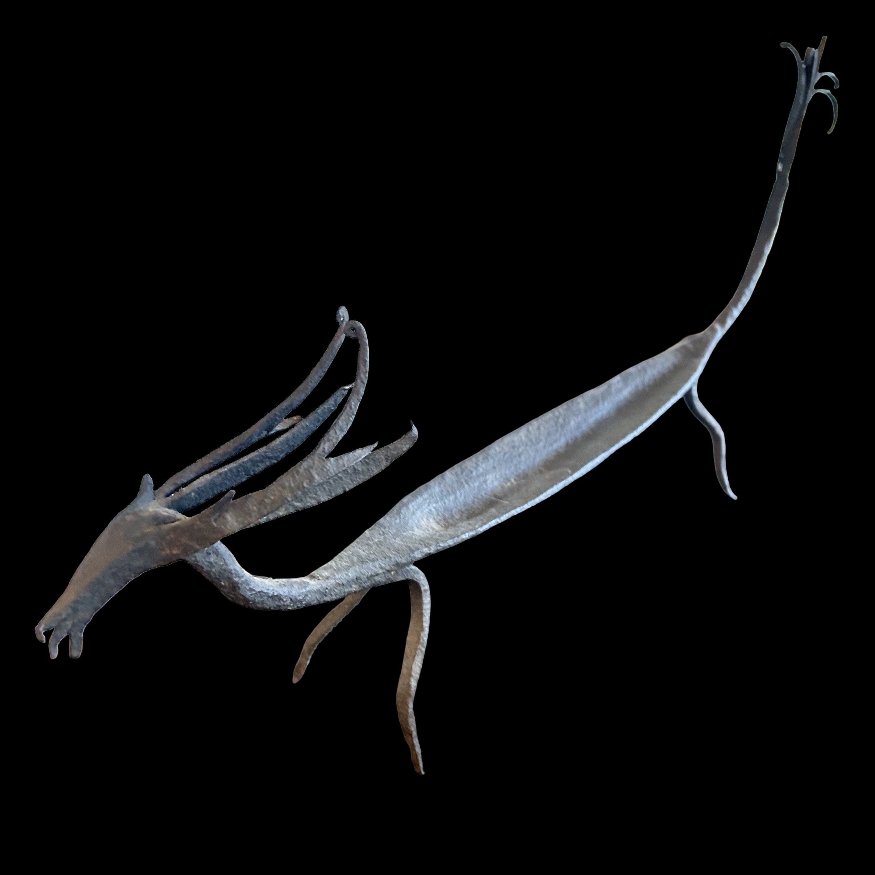 This is a traditional Sihung, an antique forged iron vessel from the Lampung region Southern Sumatra, Indonesia. It's designed as a shallow tray or pigment holder in the stylized form of a mythical creature-often interpreted as a dragon, serpent, or hybrid beast with sinuous tail, flared horns or wings at the head, and clawed legs-to contain and mix the blackening paste used in the ceremony, known as sihung or besihung. The paste, made from betel nut, lime, and other natural ingredients was applied to file and stain teeth black during adolescence rites of passage. Black teeth symbolized maturity, beauty, fertility, and high social status among Lampung women and sometimes men. The practice dates back centuries and was part of broader coming of age rituals to ward off evil spirits and mark transition to adulthood. The creature motif draws from Lampung animist and Hindu-Buddhist influences, representing protection, power or ancestral guardians. The iron construction, patinated to a silvery-gray finish over time, and intricate forging highlight skilled metalwork from pre-colonial eras. These vessels were heirlooms passed down in noble families, used in communal ceremonies.