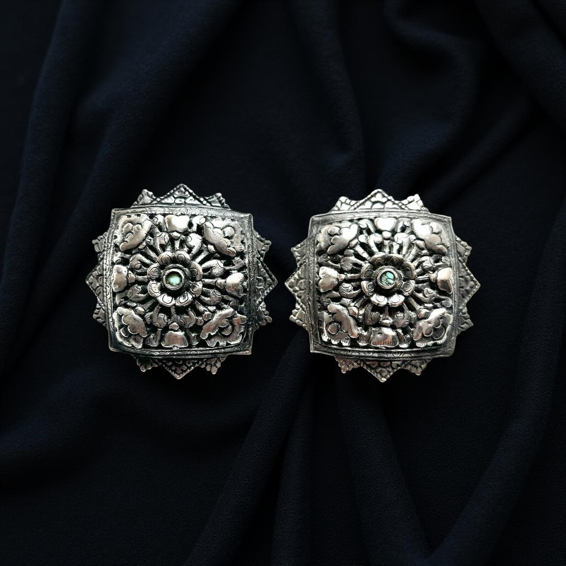 An excellent pair of silver brooch inlaid with turquoise "Korma" from Bhutan, a tiny secluded kingdom in the Himalayas. It is finely handcrafted in the open work technique.These brooches secure their national costume "Kira" in the area of the chest.The Kira is a hand woven rectangular cloth intricately designed by talented weavers in Bhutan. The Kira is often worn with colorful blouses and a jacket.