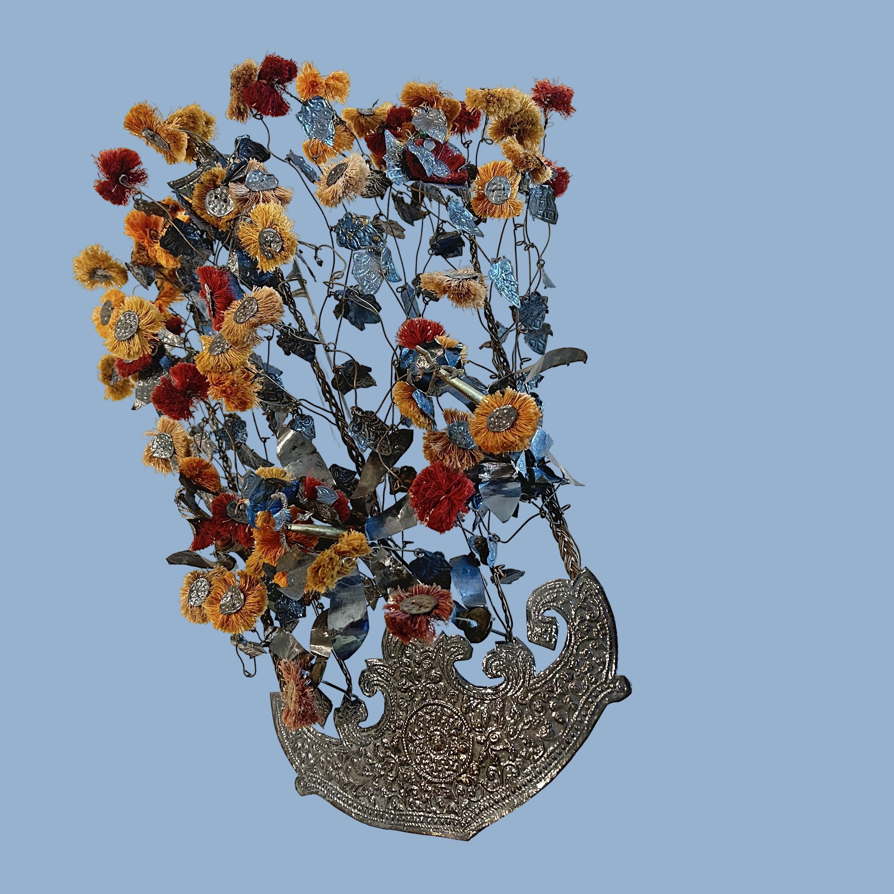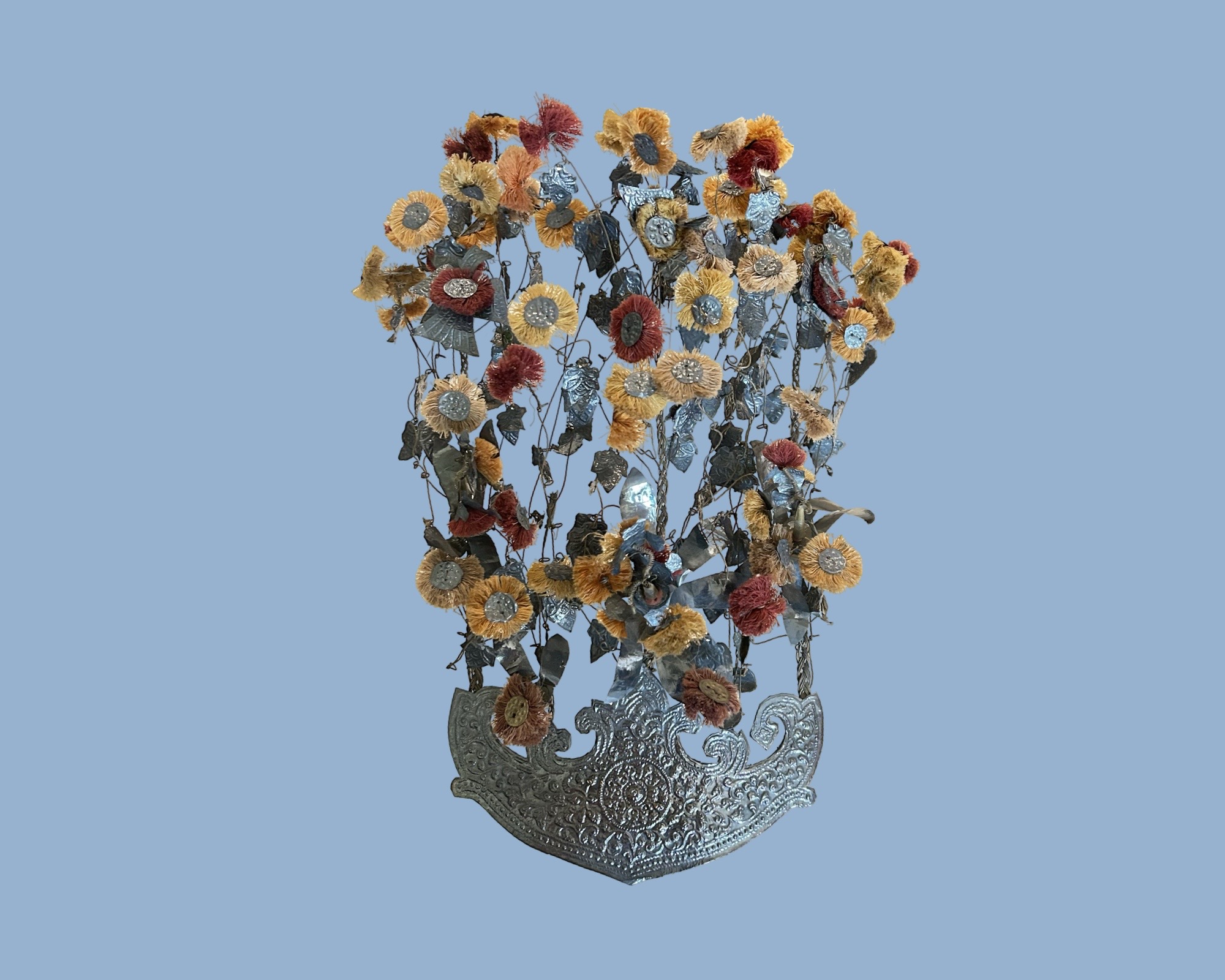 This type of ceremonial crown is typically worn by women during weddings, dances, and other cultural rituals, symbolizing nobility, wisdom, honor, and feminine strength. The design, with its ascending stems, leaves, and multi colored floral elements emerging from a metallic base, strongly evokes the "tree of life" (sekala brak) motif common in Lampung art. This motifs represents life's interconnectedness, growth, and ancestral ties, often integrated into siger designs to convey values like resilience and beauty.