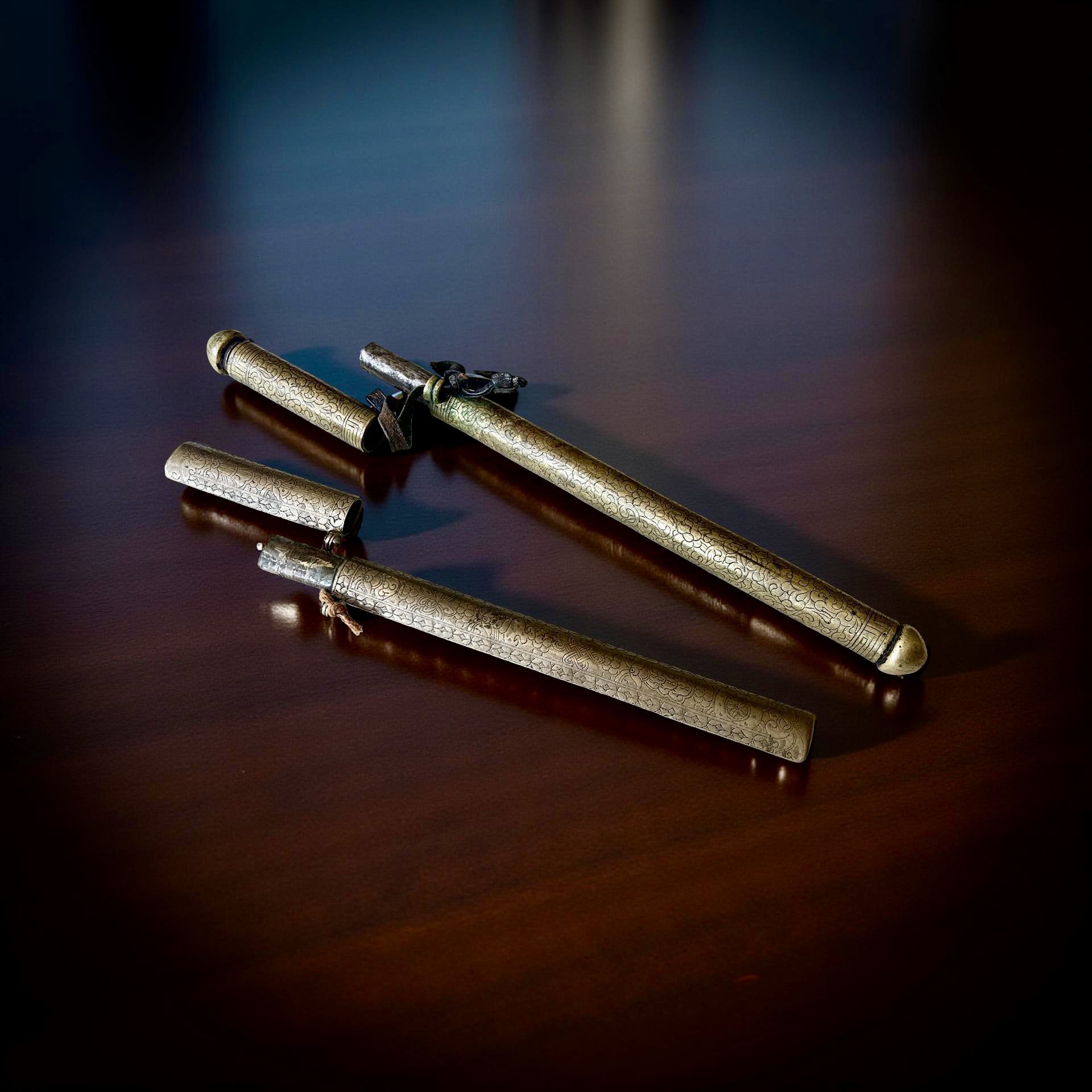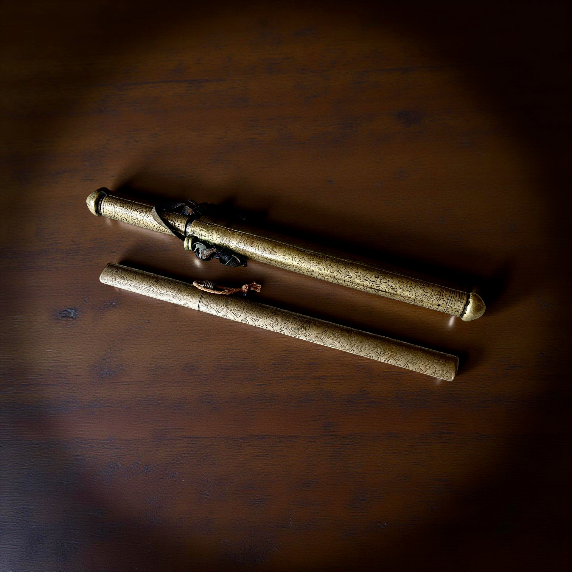 These brass mantra cylinders, handcrafted items deeply rooted in Tibetan Buddhist traditions, are classic for containing rolled prayer scrolls inscribed with mantras [e.g, "Om Mani Padme Hum,"the compassion mantra of Avalokiteshvara} The engraved patterns-flowing, swirling motifs resembling clouds, vines or auspicious floral designs are typical of chased engraving techniques used by Himalayan artisans. These decorations often draws from Tibetan iconography, such as the Eight auspicious symbols [Ashtamangala] or protective motifs to invoke blessings and ward off negativity.The brass material made them accessible to nomads and pilgrims traversing the Himalayas where they were kept close for protection during travel or they may have been for a household shrine.