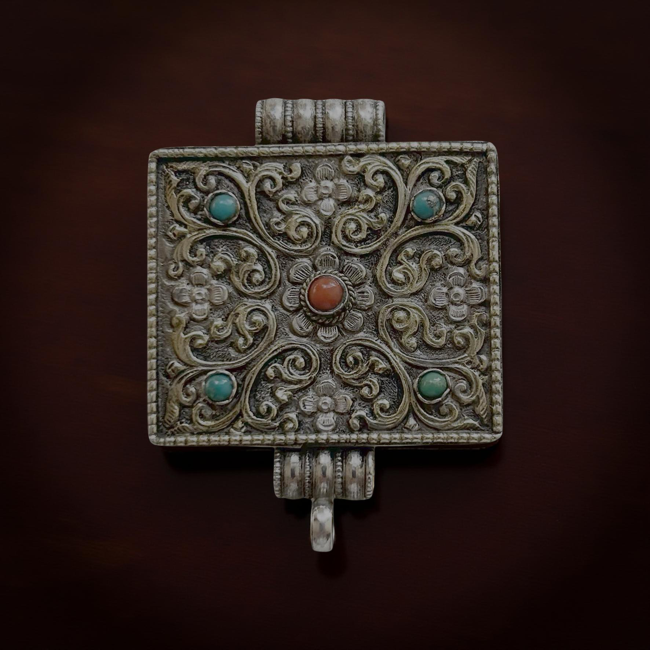 A mantra pendant: chased and repoussé silver scroll-and-flower box, keeps your blessings close.