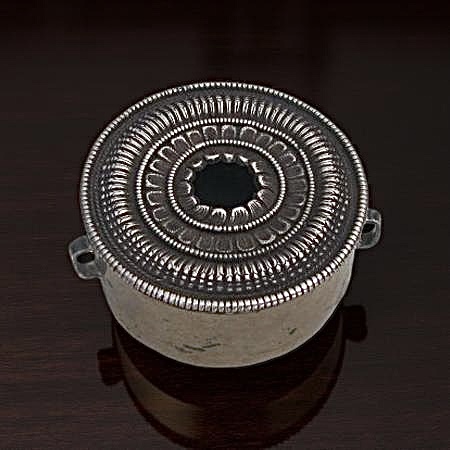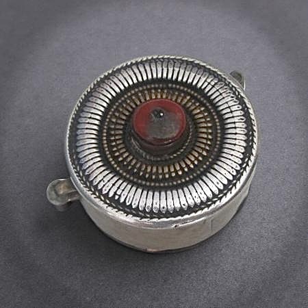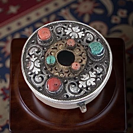 Tcherot, talismanic silver boxes can be embellished with copper or brass but never in gold because silver is the metal of the Prophet. Gold is believed to bring bad luck. These boxes contain verses of the koran.