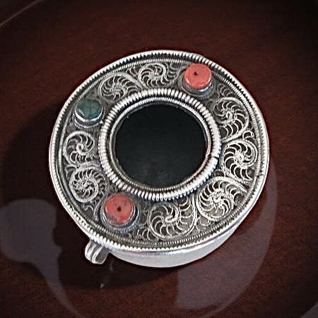 Silver amulet box with filigree top, turquoise and two corals. Its side and detachable base is made of copper.
