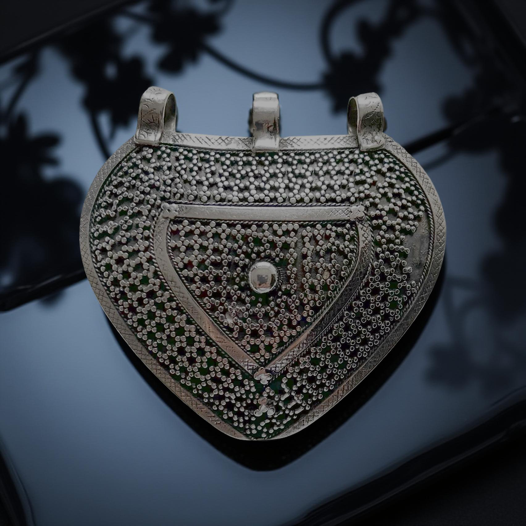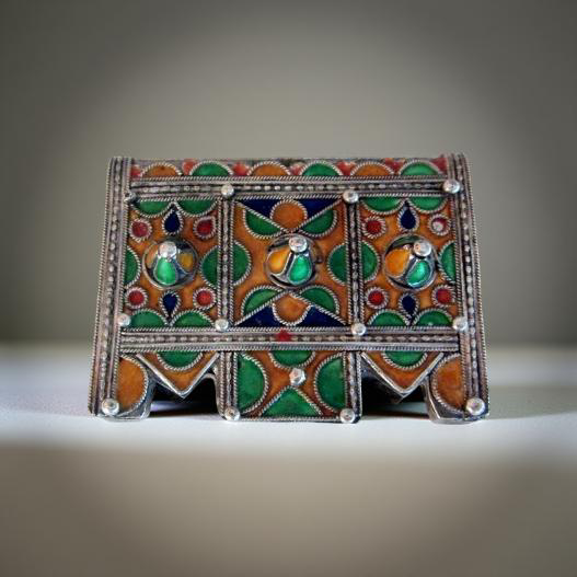 This enamelled silver amulet (Herz) are worn by women in the Anti-Atlas mountains. It contains sacred substances believed to protect the wearer. Jewish smiths who fled from the Spanish inquisition in the late fifteen century has settled in North Africa. They introduced colourful enamel and niello work which spread across the region.