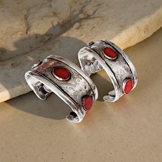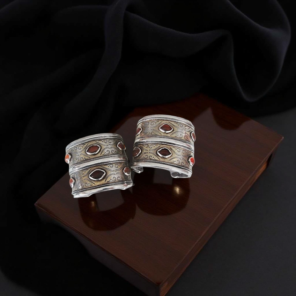 This pair of silver bracelets comes with an unusual punched-circles, eye-shaped carnelian inlay, gilded geometry underneath and feels heavier than they should. Good for stacking, better for staring at.