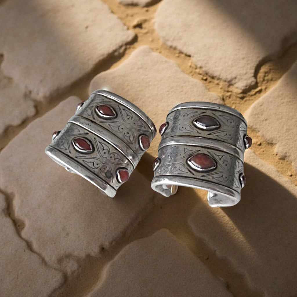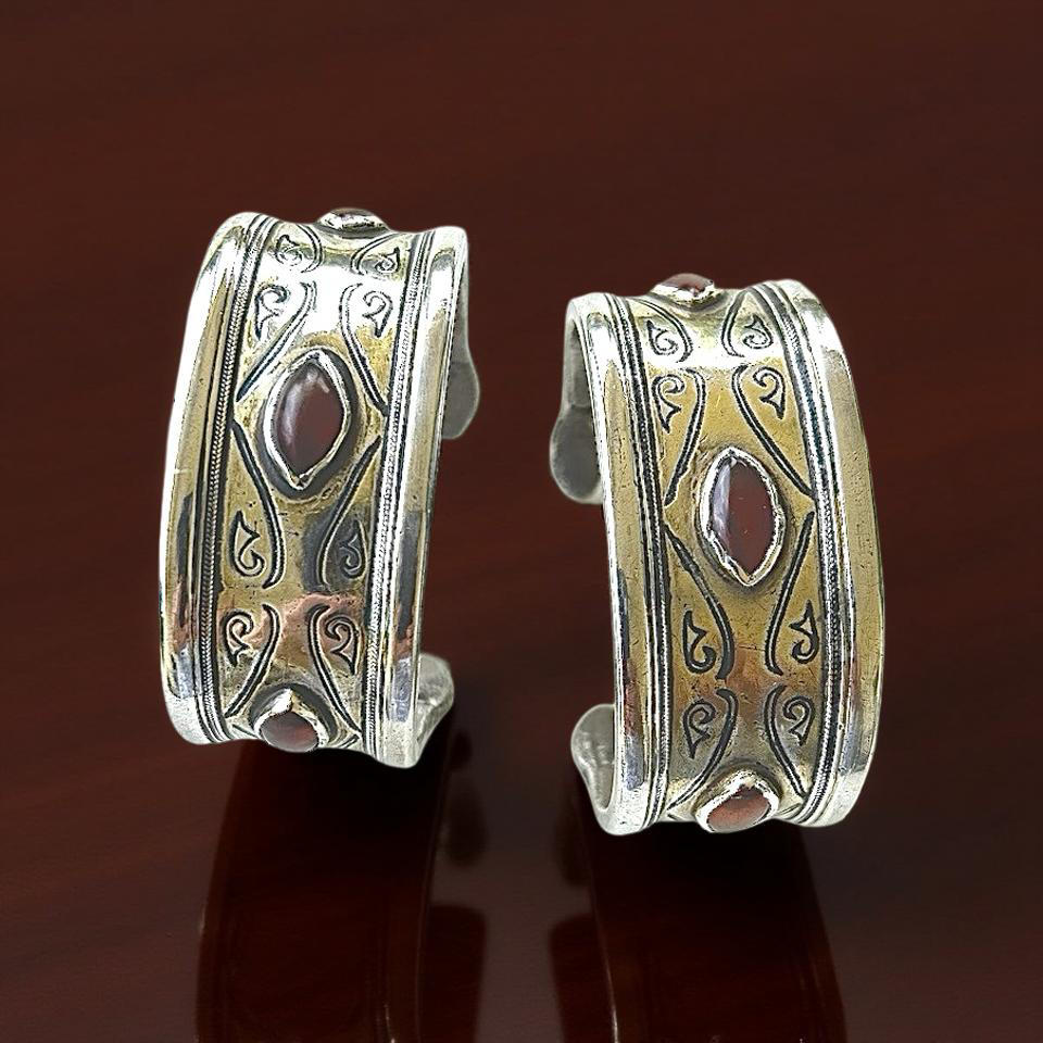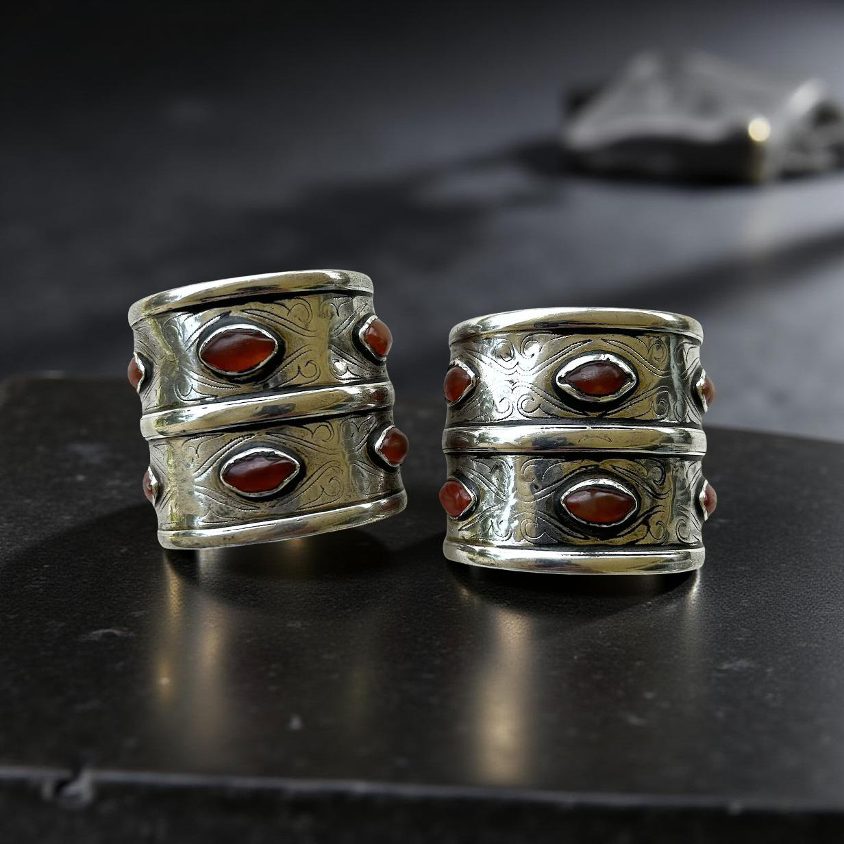 A matching pair of Turkoman bracelets adds value to your collection because they always come in pairs. Three eye shape carnelian stones are set on each tier. These are older than the oblong shape carnelian stones.