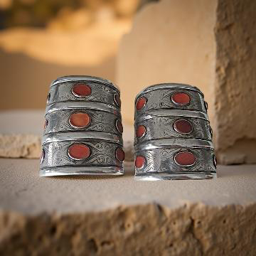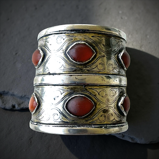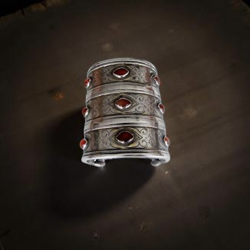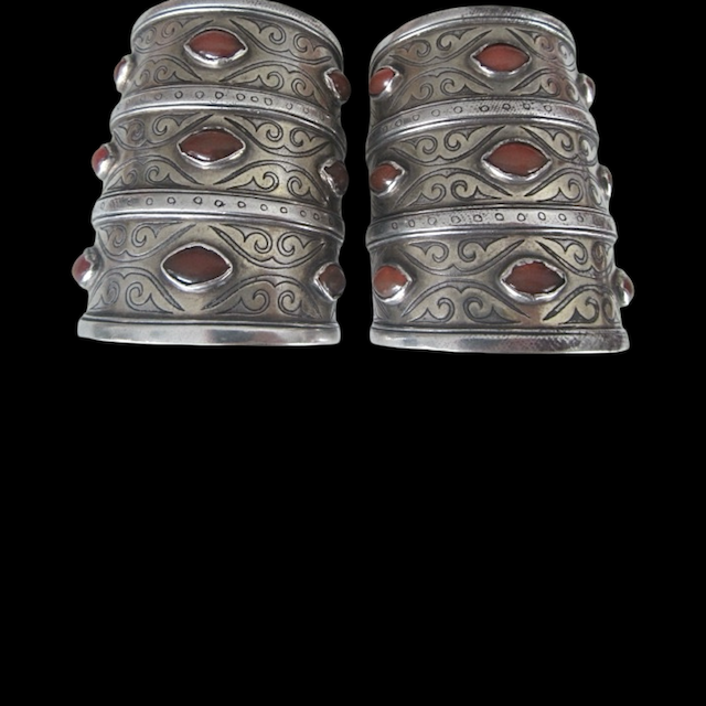 The Turkomans were nomadic farmers and herders that lived around the Karakum desert in Central Asia. Every Turkoman woman had a large amount of silver jewellery acquired through marriage. A bride from a wealthy family was usually covered with jewellery from head to toe. This was part of the dowry besides carpets and textiles on her wedding. The large amount of silver created for the Turkomans were bought with the carpets knotted by females. They were made of the purest silver by craftmen moving from nomad camps to nomad camps. Silver jewellery was the best form of security to be carted on their bodies in this hostile area of sandy plains as they can be simply exchanged for money and goods. On top of that they also functioned as protective amulets. Blue colour were supposed to deflect the evil eye and the orange carnelian stones embedded in these bracelets were symbolic of fertility, blood and life.