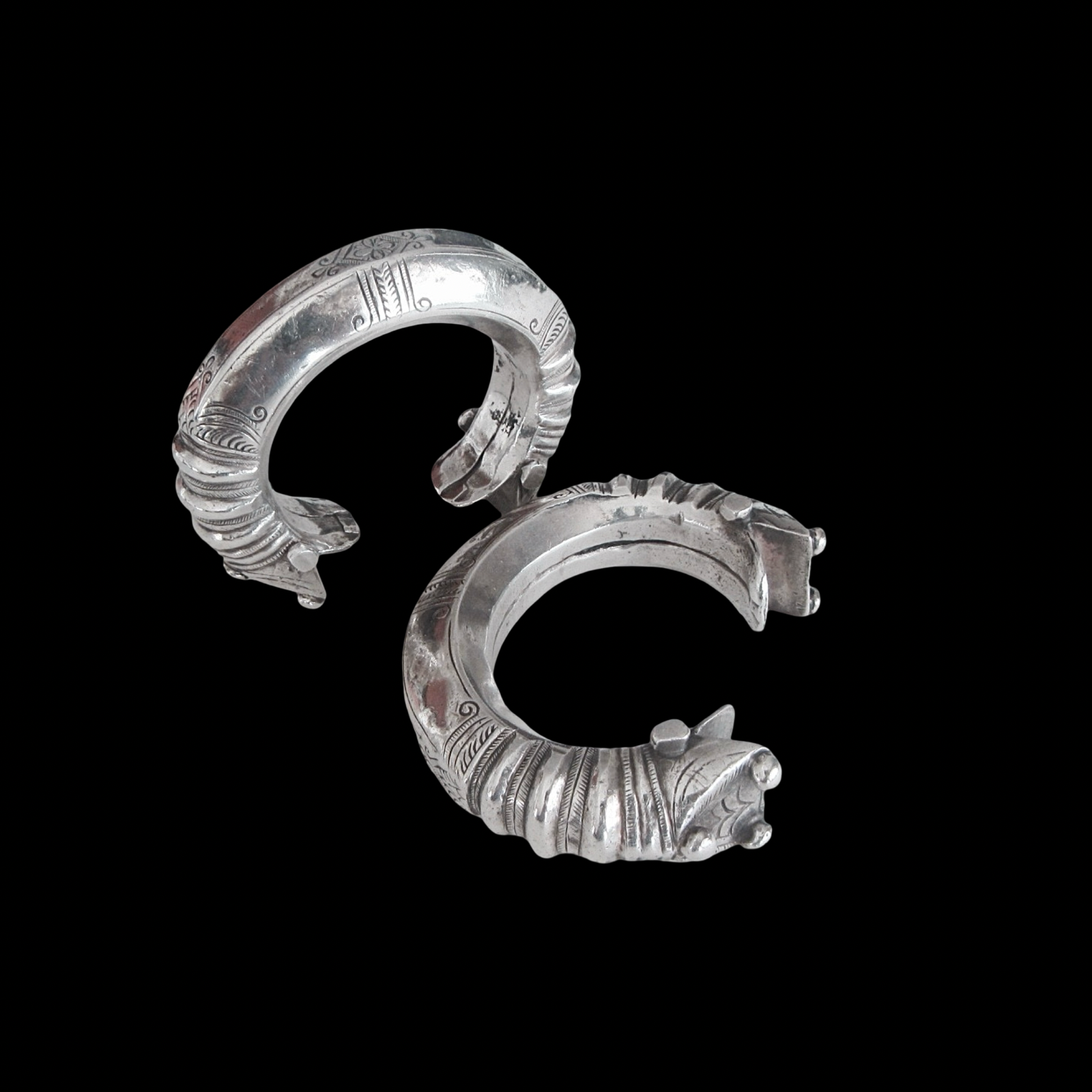 This pair of well weathered silver bracelets bears repoussé and incision work with added silver balls to the animal-head terminals which may be tiger, lion, snakes, dragon and the very popular elephant heads known as Makara: a mythic water beast blending crocodile-jaw, elephant trunk and fish tail, Ganga's own mount. Touching it promises rich, flowing fertility.
