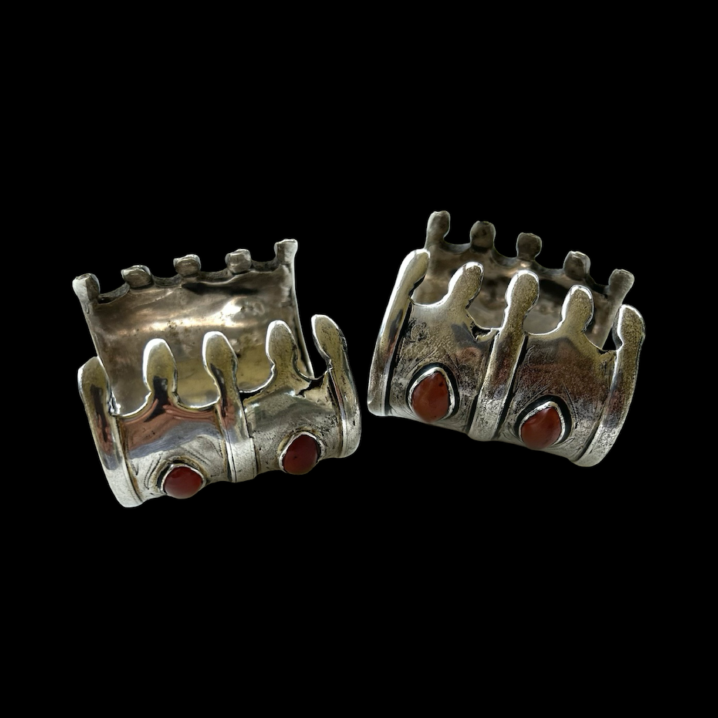 A matching pair of Turkoman bracelets adds value to your collection because they always come in pairs. Three eye shape carnelian stones are set on each tier. These are older than the oblong shape carnelian stones.