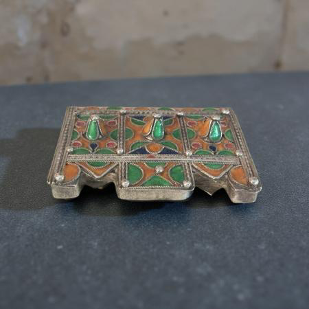 This enamelled silver amulet (Herz) are worn by women in the Anti-Atlas mountains. It contains sacred substances believed to protect the wearer. Jewish smiths who fled from the Spanish inquisition in the late fifteen century has settled in North Africa. They introduced colourful enamel and niello work which spread across the region.