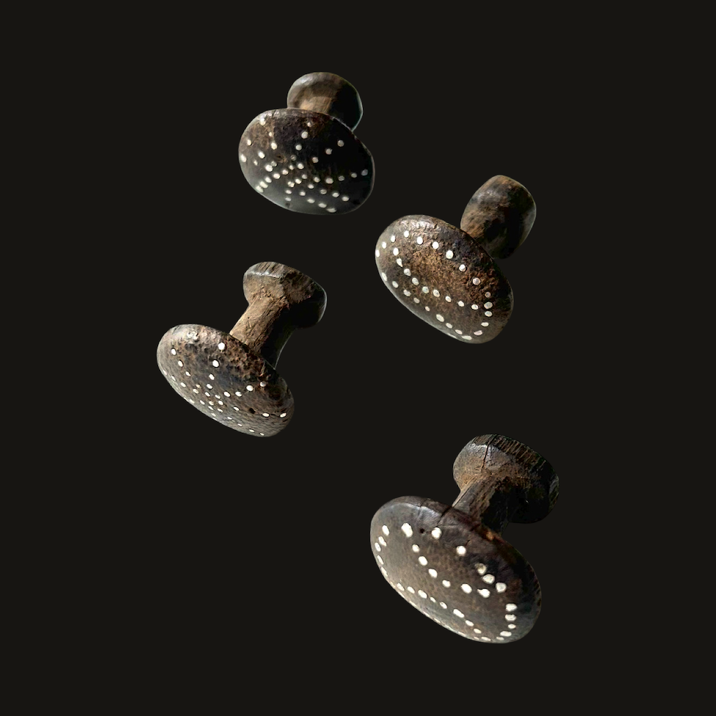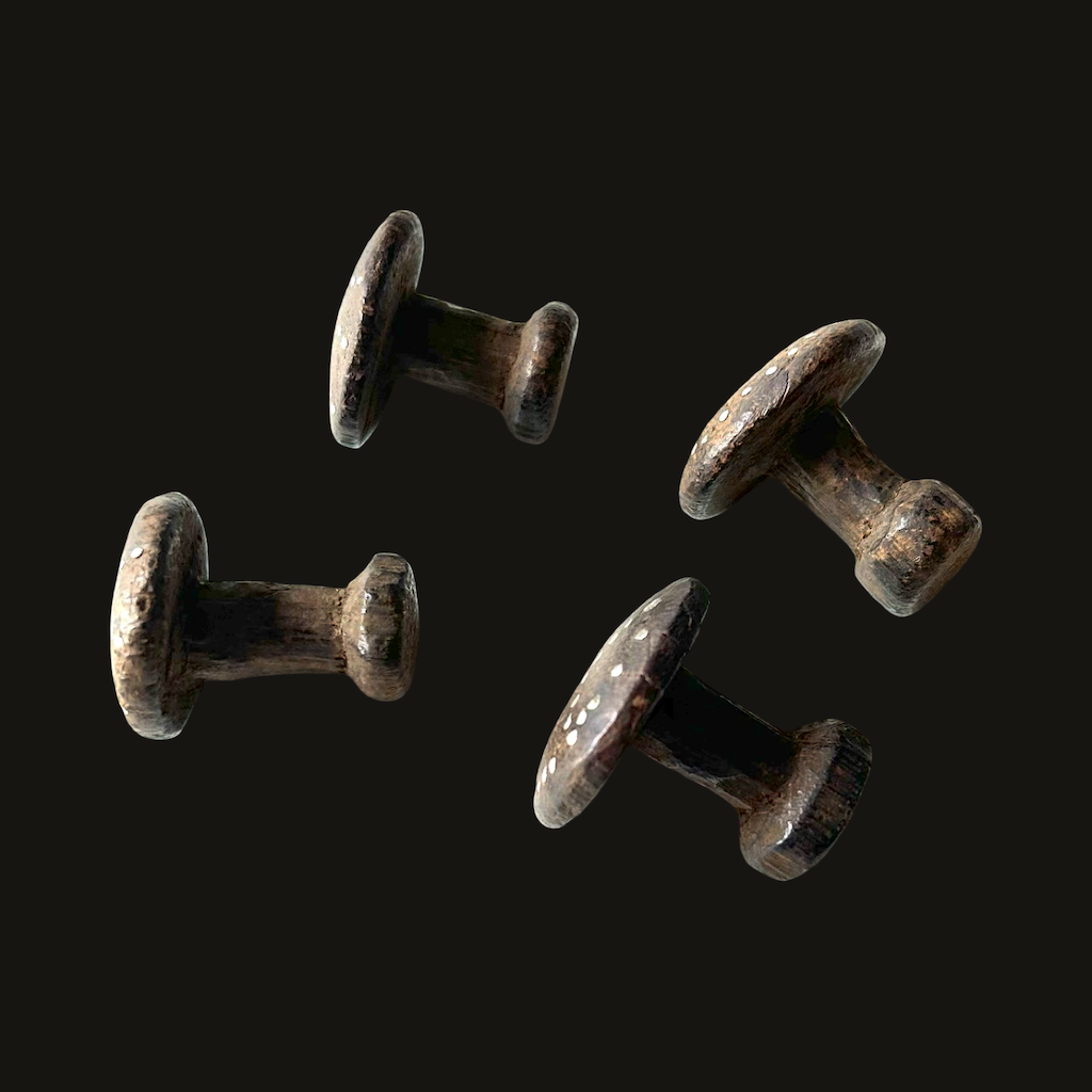 Two pairs of wooden Naga ear plugs inlaid with dotted silver studs. They are carved and inserted to elongated ear lobes.