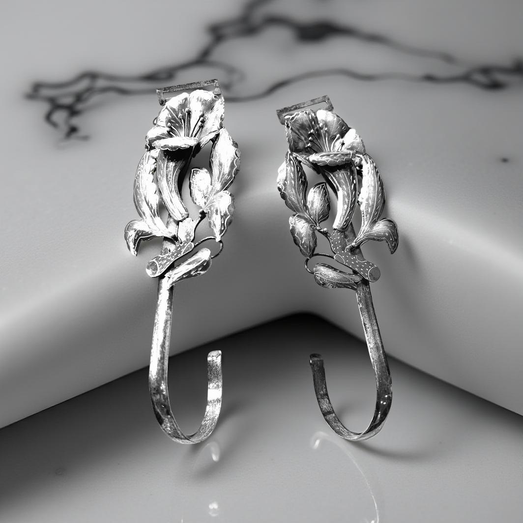 A pair of silver curtain holdbacks shaped like morning glory or trumpet flowers.