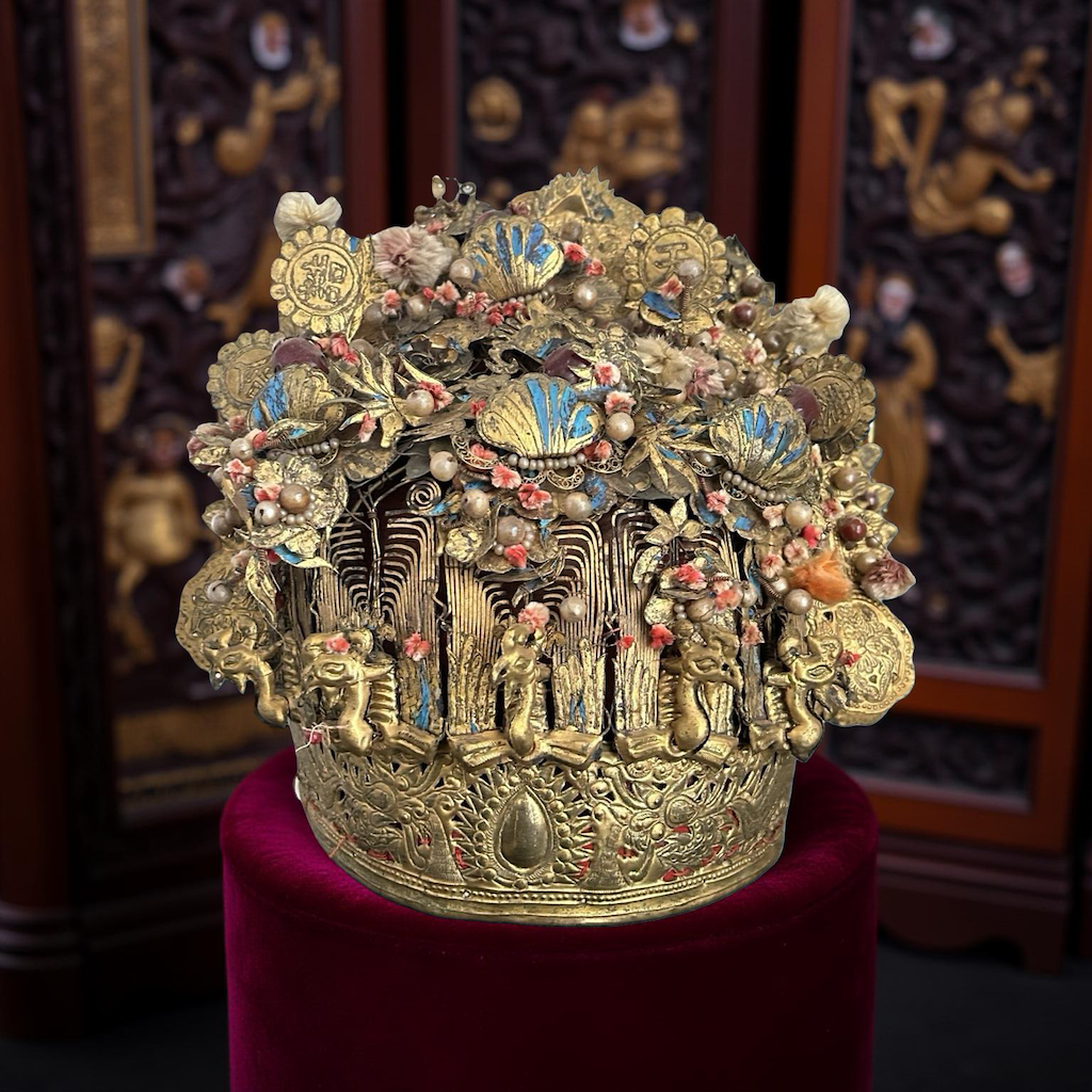 The fengguan, or phoenix crown, was a traditional Chinese headdress worn by noblewomen, empresses, and brides during the Ming and Qing dynasties. Forged from a gold-plated base with delicate filigree and carvings, it’s crowned by golden phoenixes-symbols of prosperity and fertility. Rare blue inlays come from kingfisher feathers, a luxurious import that shimmers vividly. Pink and red flowers, crafted from enamel and silk, mingle with pearls, beads, and gemstones like rubies or corals in motifs of blooms, clouds, and leaves. Social rank shines through the design: an empress’s might boast twelve dragons and phoenixes, embedded with thousands of pearls and over hundred gems.