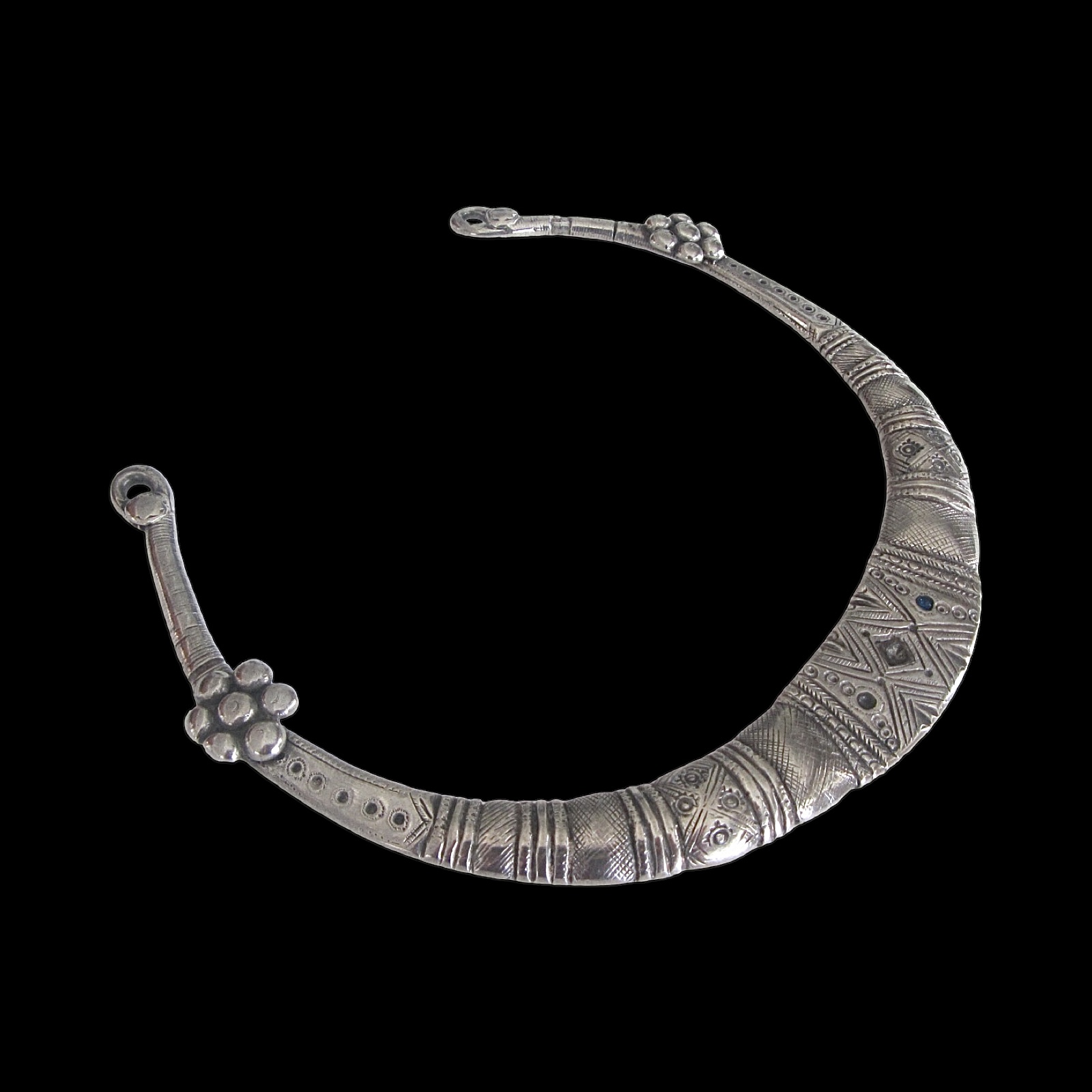 A flat and solid silver neck ring etched deep and dotted with colored glass stones, long since lost to time. Still, you can see where they sat. Tapers to those semi-S curls with flowers on each side, proper Kuchi flourish. Still 1950's, mind. That wear just tells its story.