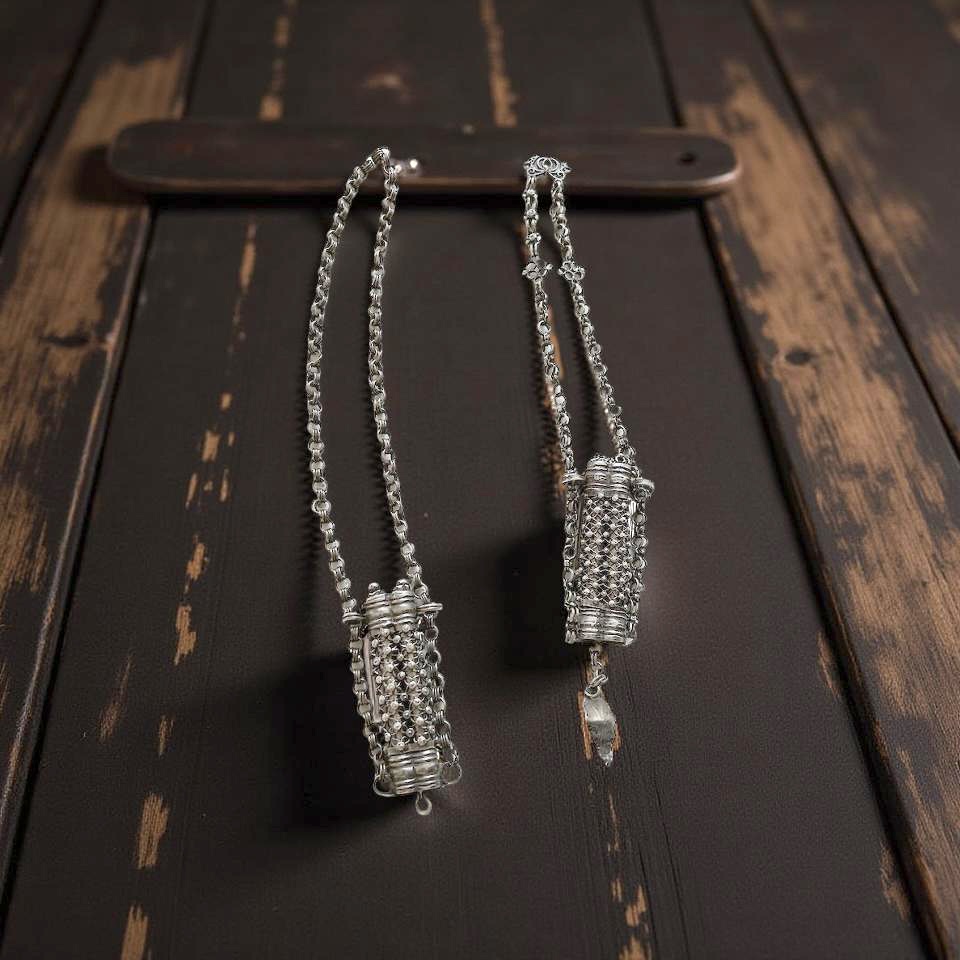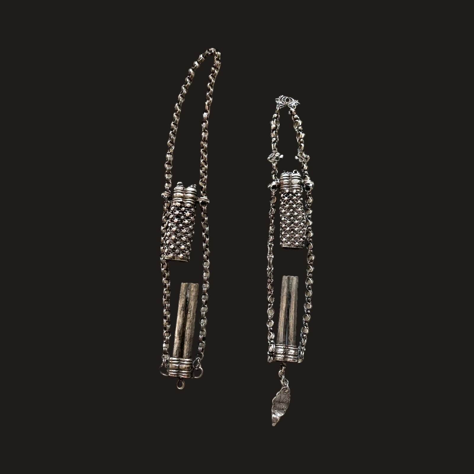 Latticed open-work silver needle cases from the Yunnan's hill people in South Western China. Double-tubed for thick and thin needles, fused together in delicate open work. Worn on the neck or secured to a waist sash.
